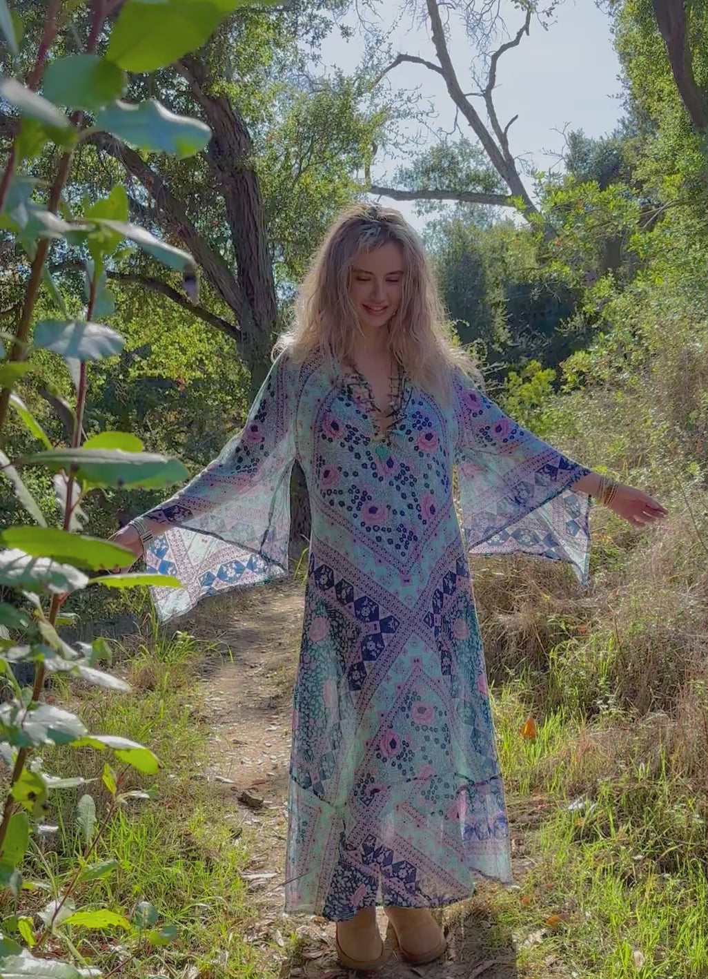 Handcrafted in India, this dress is a true work of art. The attention to detail and quality of craftsmanship is evident in every stitch. So go ahead, treat yourself to the Audrey Maxi Dress with Butterfly Sleeves in Blue and let your inner goddess shine.
