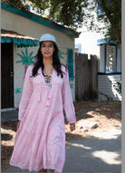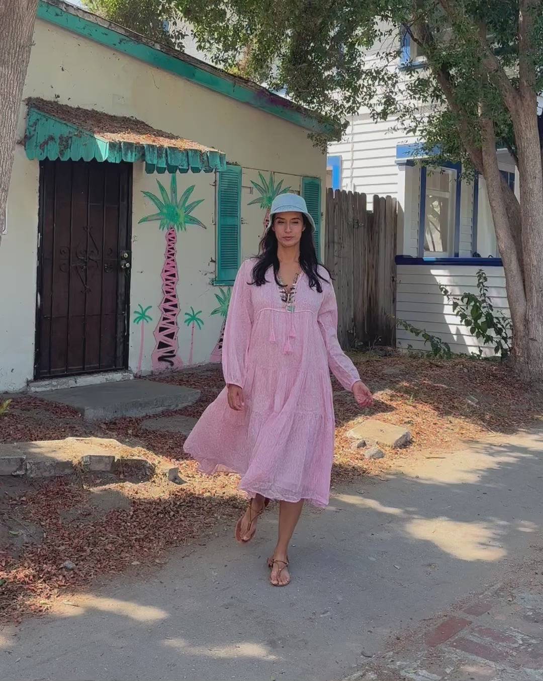 The Kayla Printed Midi Dress in pink is your new go-to for effortless charm and comfort. Crafted from 100% soft cotton, it feels light and breathable all day long. This dress shines with delicate embroidery that adds a touch of elegance, while its long sleeves and playful tassel detail bring a flirty finish. Whether you're headed to brunch, a garden party, or a casual day out, the Kayla dress keeps you stylish and comfy. Available in sizes SM and ML, it's the perfect mix of graceful and fun for every occasion. Embrace the pink and let your style bloom!