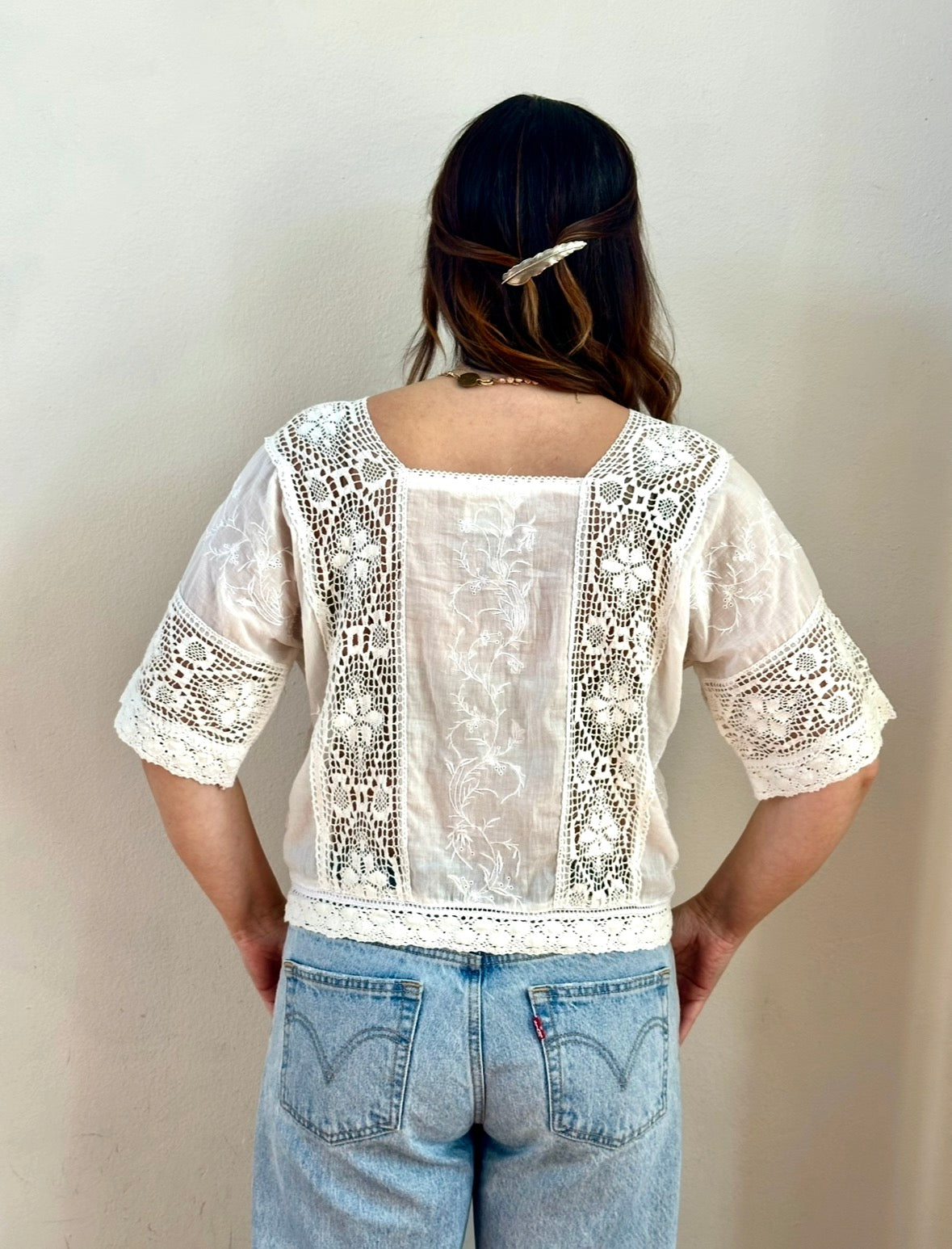 Meet the Betty. A whimsical short-sleeve blouse that captures bohemian romance in every stitch. Crafted in pristine white with intricate floral embroidery and delicate lace detailing, this top is pure boho magic. The relaxed short sleeves keep things breezy and comfortable, while the ornate needlework adds that artisanal touch that makes you feel like you're wearing wearable art. Throw it on with your favorite jeans, a flowing skirt, or layer it over a slip dress for instant wanderlust-worthy style. The Betty is your ticket to looking effortlessly put-together while keeping that carefree, spirited vibe alive.