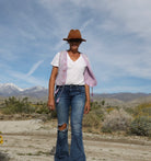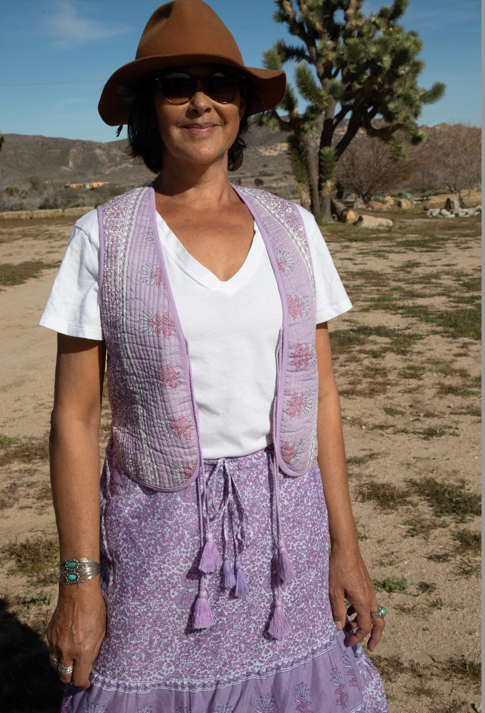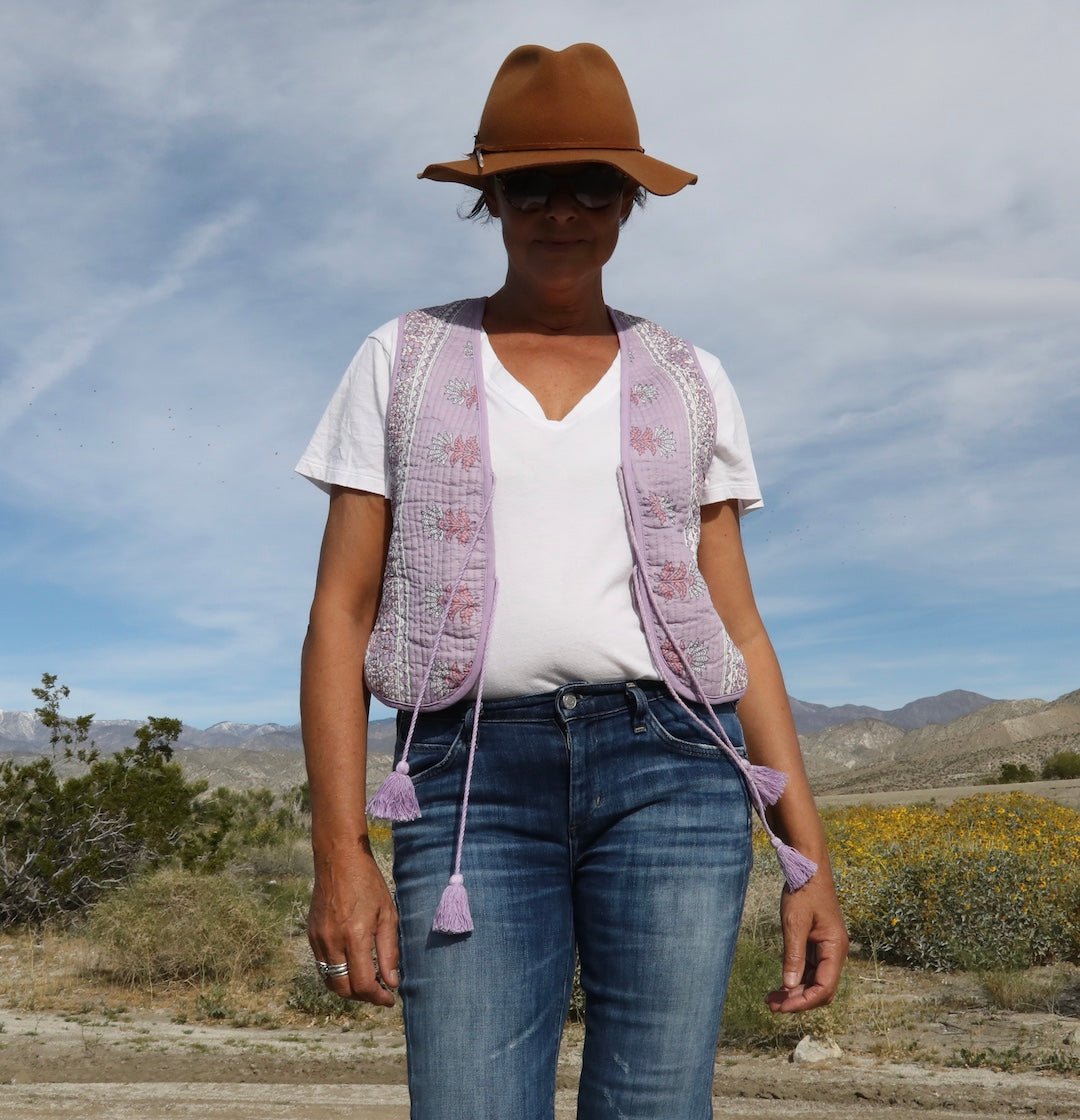 Slip into effortless bohemian style with this charming sleeveless vest. Crafted from soft cotton, it features a whimsical print that brings personality to any outfit. The adjustable strings let you customize the fit for the perfect silhouette. In gorgeous lilac and purple tones, June is your go-to piece for layering with flair. Perfect for warm days, festival vibes, or whenever you want to add a touch of carefree elegance to your look.