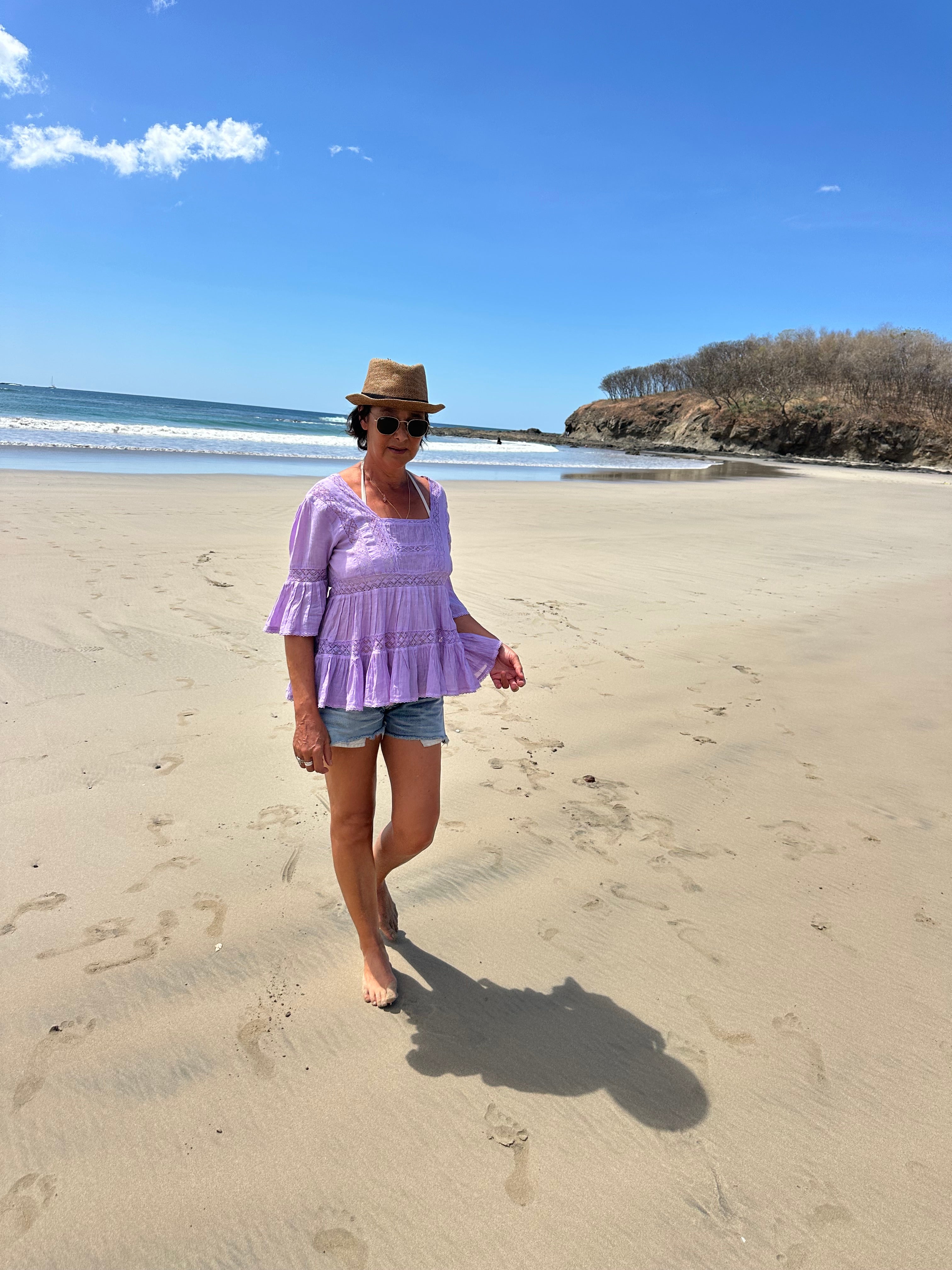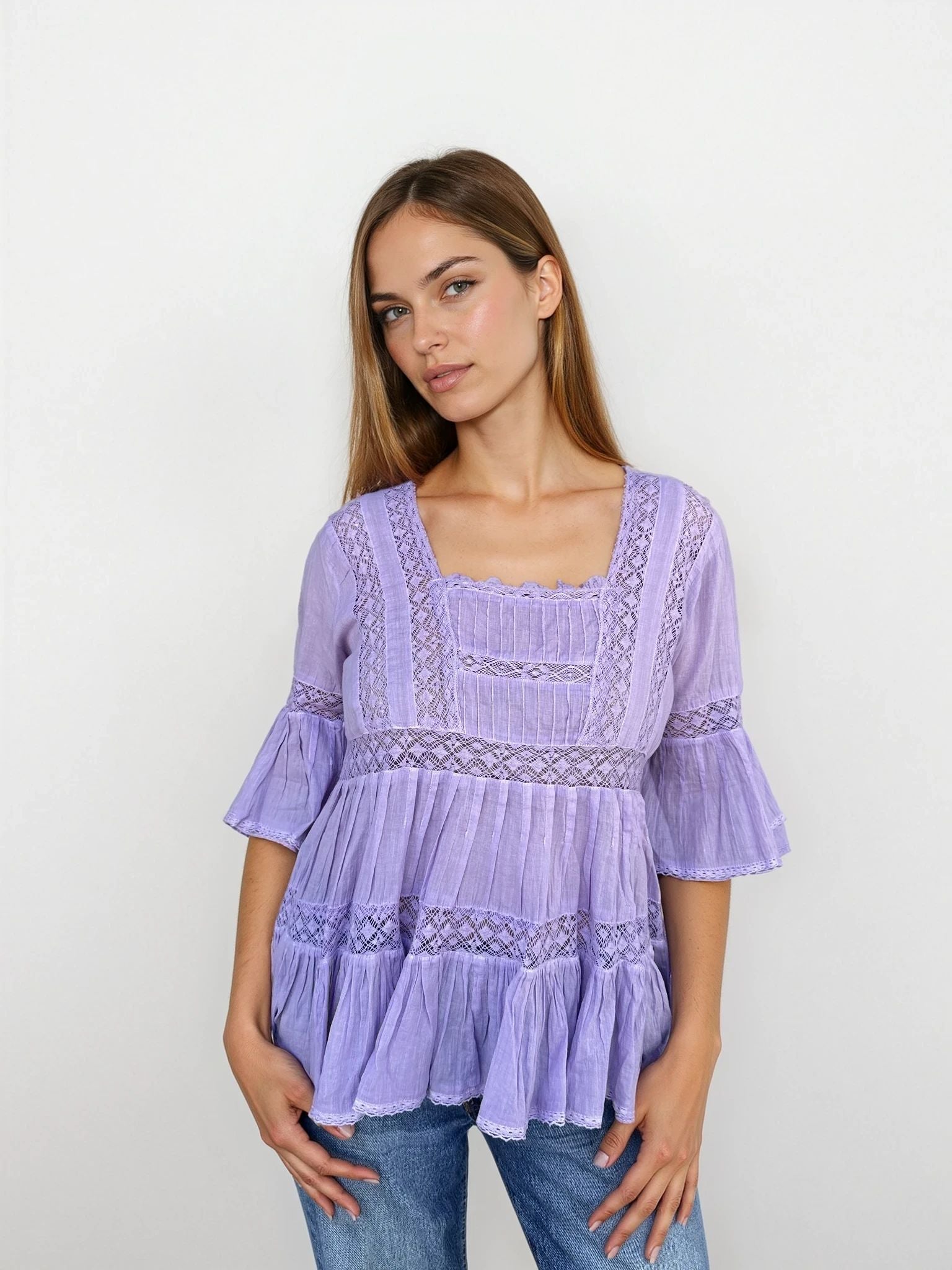 Embrace your boldest self in this Louise Short Sleeves Blouse, where delicate lace meets daring style. The soft lilac hue captures summer's most enchanting moments, while intricate lace detailing adds an unexpected edge to your beach wardrobe. Perfect for those who refuse to blend in. Pair it with linen shorts for effortless coastal confidence or layer it over a slip dress for evening intrigue. Breathable and beautifully crafted, this blouse transforms ordinary beach days into unforgettable statements.