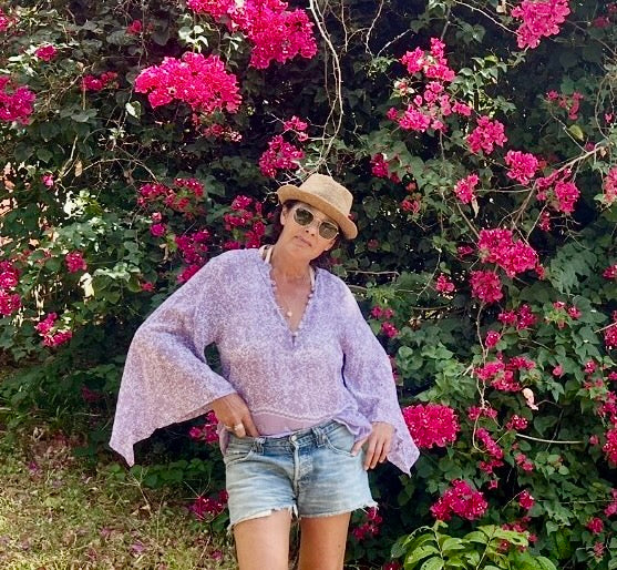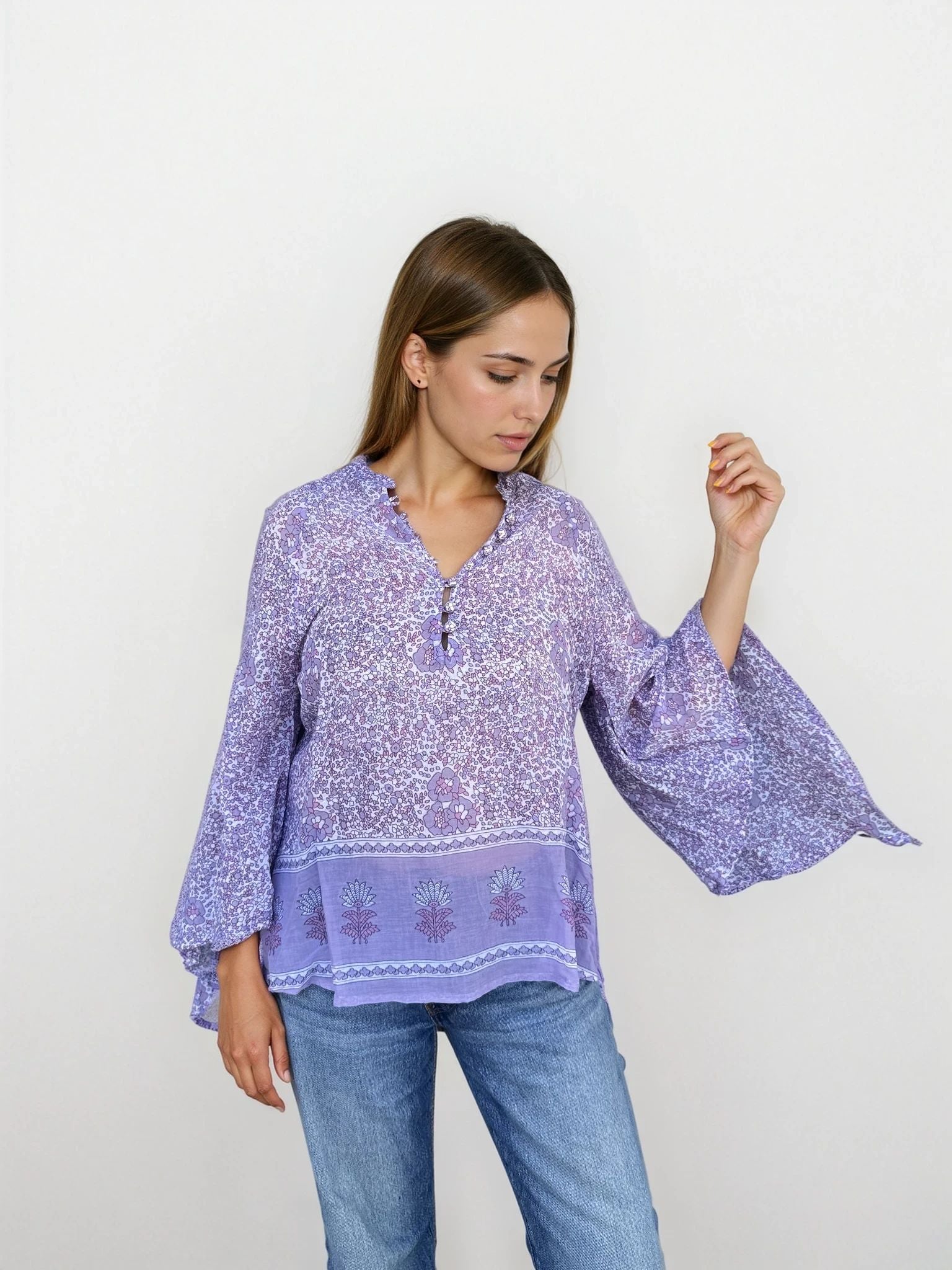 Embrace your wildest festival spirit in this audacious lilac blouse, where delicate butterfly sleeves flutter with untamed energy. Perfect for Coachella or any bohemian adventure, this printed piece channels effortless rebellion with its flowing silhouette and daring color. Let your inner free spirit soar. This is the blouse that turns heads and breaks boundaries.