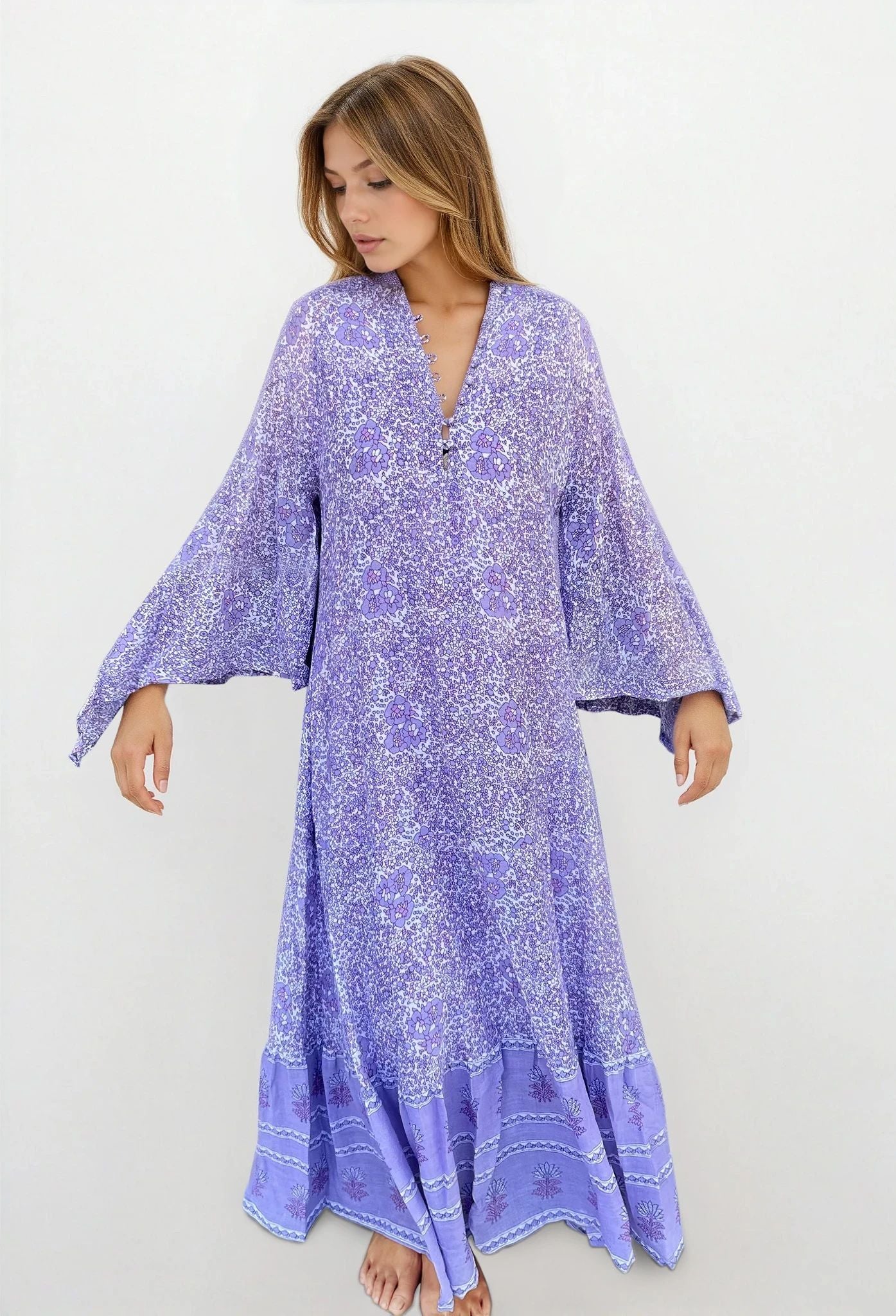 Twirl into bohemian bliss with the Audrey Printed Maxi Dress, where whimsical butterfly sleeves flutter with every step. This lilac beauty captures free-spirited hippie vibes with its flowing maxi silhouette and enchanting prints. Perfect for festival season, beach getaways, or whenever you want to channel your inner flower child. Embrace the magic of effortless, boho-chic style that celebrates your adventurous soul.