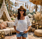 Meet the Betty. A whimsical short-sleeve blouse that captures bohemian romance in every stitch. Crafted in pristine white with intricate floral embroidery and delicate lace detailing, this top is pure boho magic. The relaxed short sleeves keep things breezy and comfortable, while the ornate needlework adds that artisanal touch that makes you feel like you're wearing wearable art. Throw it on with your favorite jeans, a flowing skirt, or layer it over a slip dress for instant wanderlust-worthy style. The Betty is your ticket to looking effortlessly put-together while keeping that carefree, spirited vibe alive.