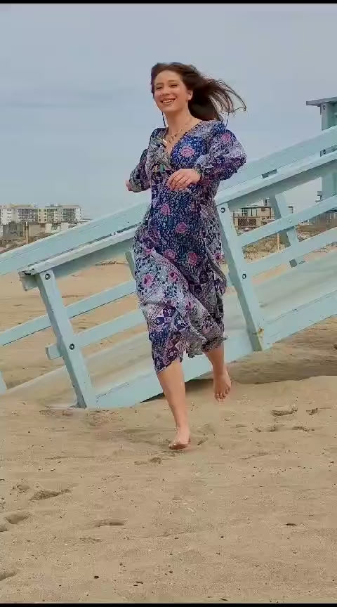 Naomi Printed Maxi Wrap Dress Long Sleeves Blue